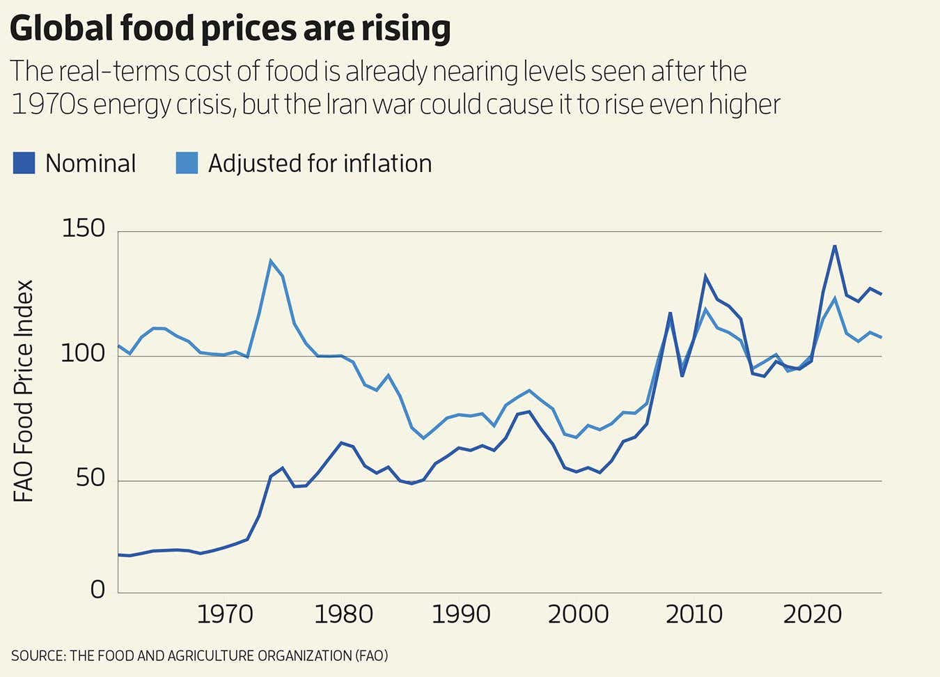 Global food prices hit their highest levels on record after the 1970s energy crisis, triggered by conflict in the Middle East, once inflation is corrected for. Could we be headed for a new record – the worst food shock ever – as fuel, fertiliser and pesticide prices skyrocket because of the turmoil in Iran?